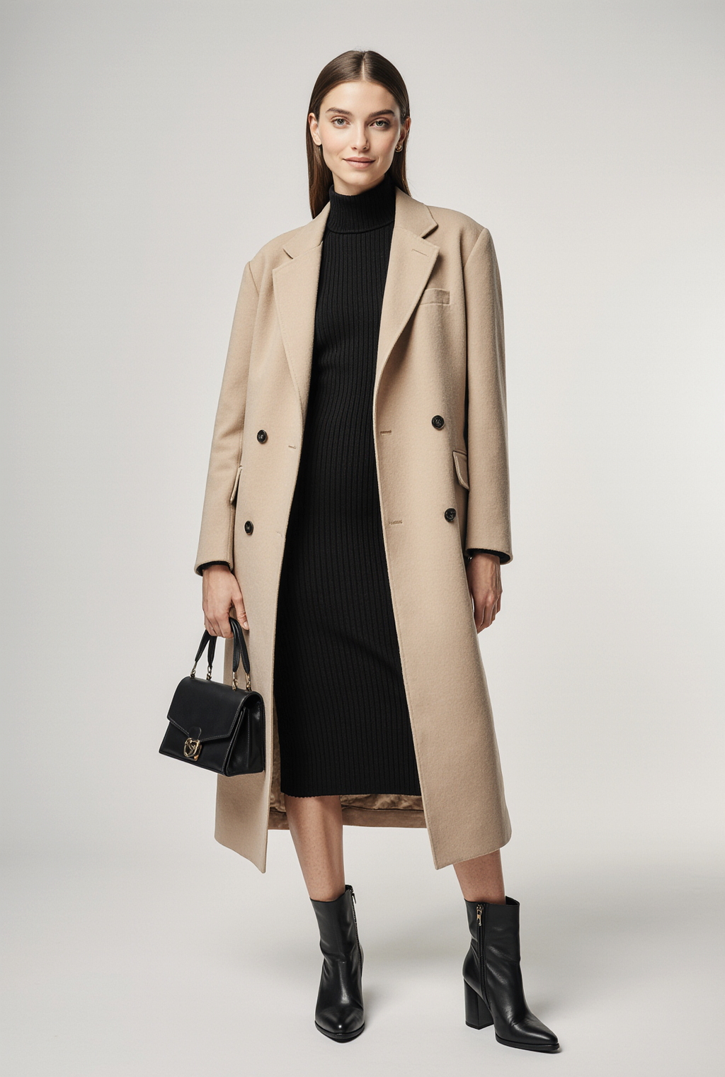 Pro minimalistky se hodí kombinace tón v tónu – černé šaty s černým alpakovým kabátem. Pokud ale chcete přidat výraz, zkuste barevné doplňky – růžovou kabelku nebo vínovou šálu.