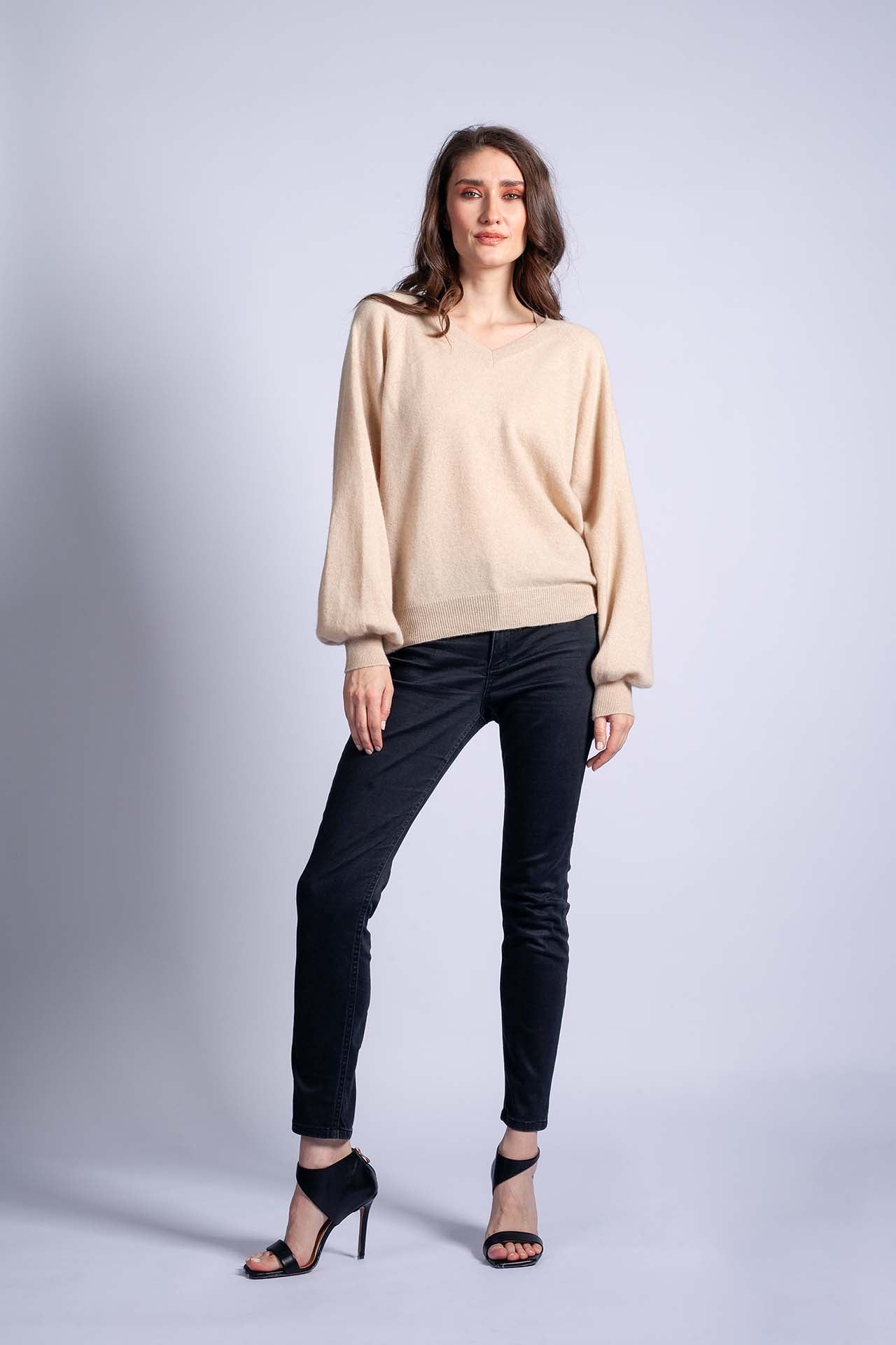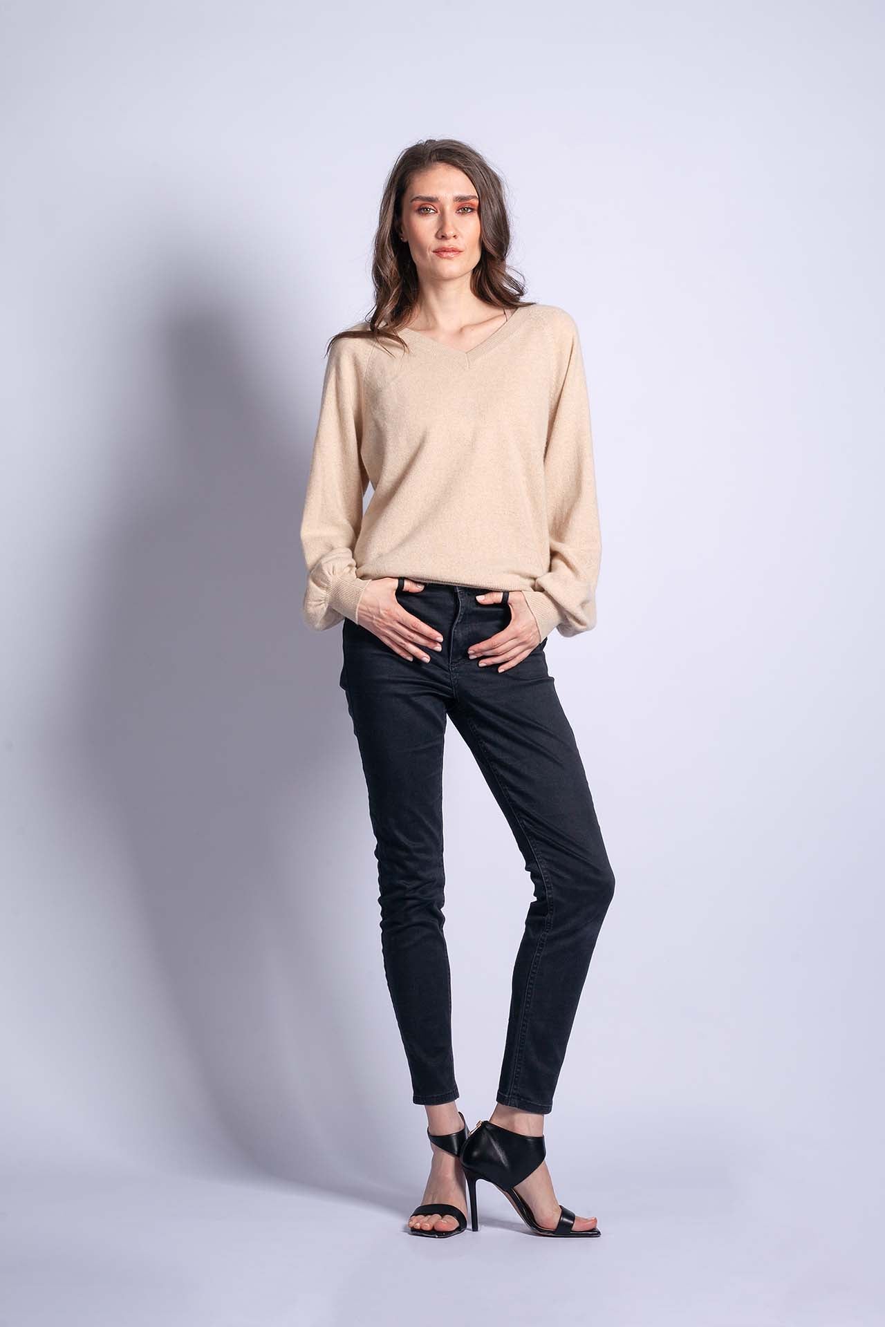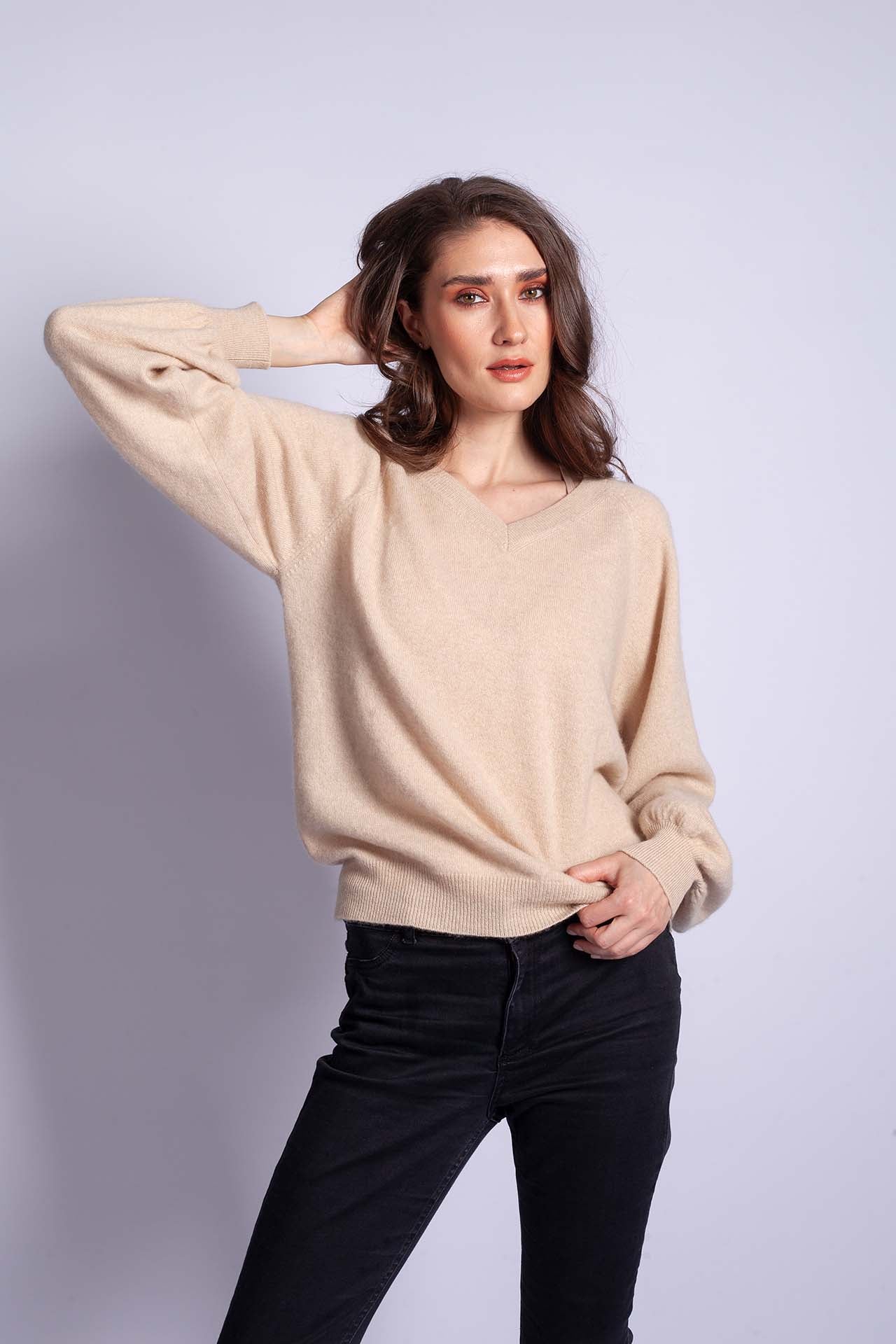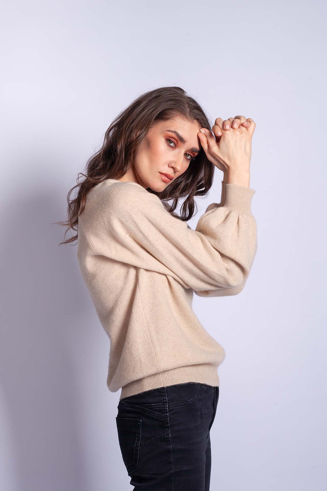 CELESTE is a wonderfully lightweight cashmere top with a V-neck and gently gathered balloon sleeves – just the right combination of classic elegance and a subtle twist that can liven up any outfit. It looks very feminine, and the organic beige lets your softness and charm stand out.