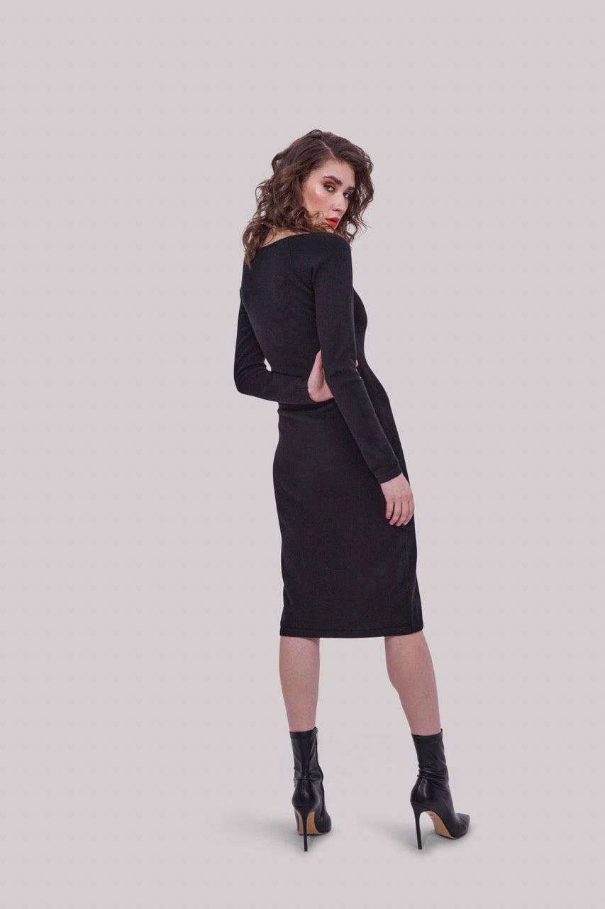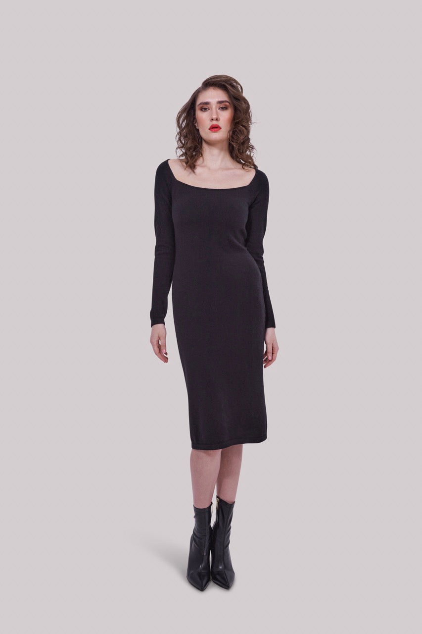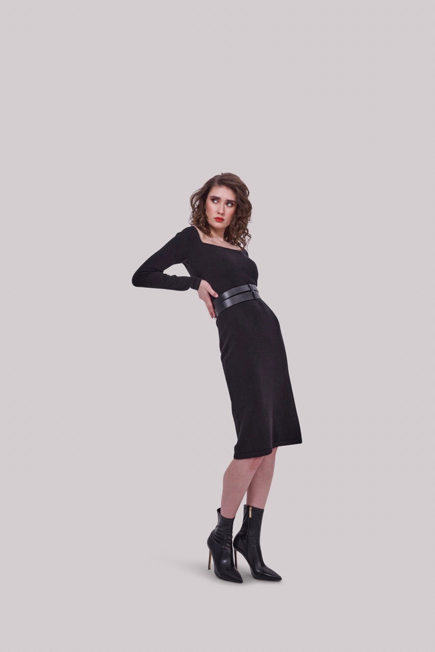 Can small evening dresses be made of cashmere? Well, the world would be missing out on a great beauty! We present to you our cashmere evening dress with a sophisticated neckline that will guarantee that everyone will think of you for the entire evening/night/lifetime. The lightweight knit is beautifully breathable, the knee-length is incredibly elegant and sexy. For a rebellious look, we recommend pairing it with our Hug Me Double belt.