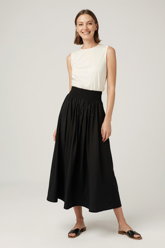 Zvýšený pružný pas lichotí postavě, netlačí, a přizpůsobí se postavě. Sukně se při chůzi ladně vlní a vytváří siluetu, ve které se budete cítit sebevědomě a žensky – i když zrovna pospícháte s nákupní taškou.